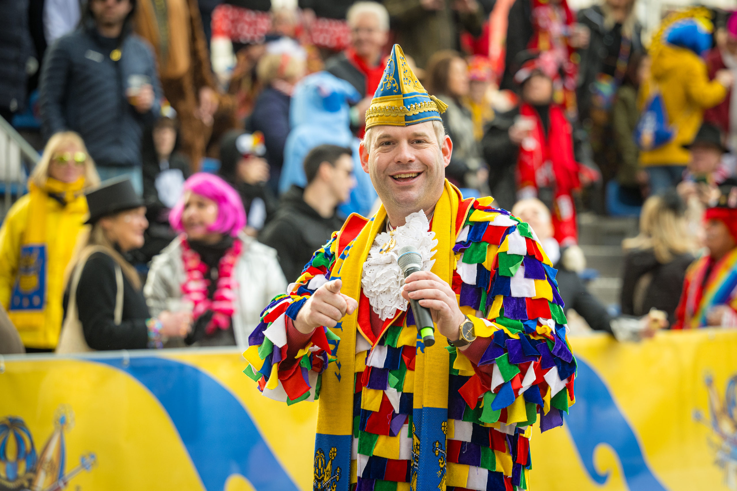 Um 11.00 Uhr fällt der Startschuss zur riesigen Freiluftparty. Für die richtige Stimmung vor und während des Zuges sorgt Ken Reise. Mit Musik, Wort und Witz begleitet er Sie durch den Rosenmontag.